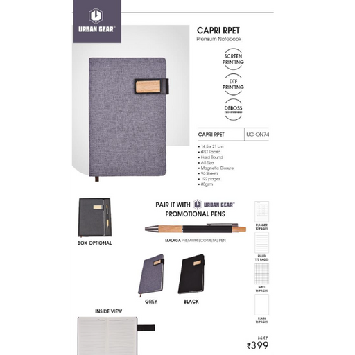 View full detailsCAPRI RPET14.5 x 21 cmrPET FabricHard BoundA5 SizeMagnetic Closure96 Sheets 192 pages 80gsmINSIDE VIEWPLANNER 12 PAGESRULED 175 PAGESGRID 16 PAGESP...