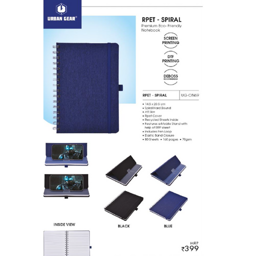 View full detailsRPET - SPIRAL14.5 x 20.5 cmSpiral Hard BoundA5 SizeRpet CoverRecycled Sheets insideFeatures a Mobile Stand withhelp of RPP sheetIncludes Pen LoopEl...