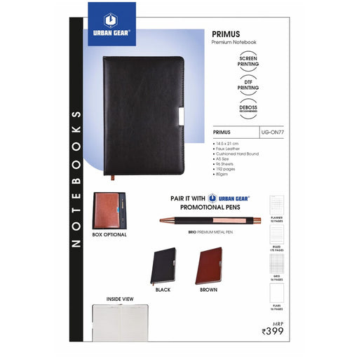 View full details14.5 x 21 cmPremium NotebookFaux LeatherCushioned Hard BoundA5 Size96 Sheets192 pages80gsmBRIO PREMIUM METAL PENBOX OPTIONALBLACKBROWNINSIDE VIEWPL...