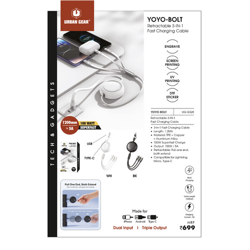 YOYO-BOLT3-in-1 Fast Charging Cable Length: 1,2MtrRetractable 3-IN-1 -New features, cables with C PIn input and USB input !Cable Length 1200mmFast ...