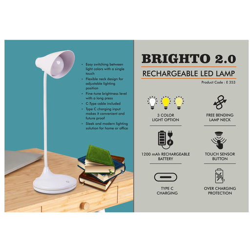 Brighto 2.0 : Rechargeable LED lamp | 3 Color light with Brightness adjustment | Type C Charging - E 353