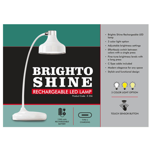 Brighto Shine : Rechargeable LED lamp | 3 Color light with Brightness adjustment | Type C Charging - E 356