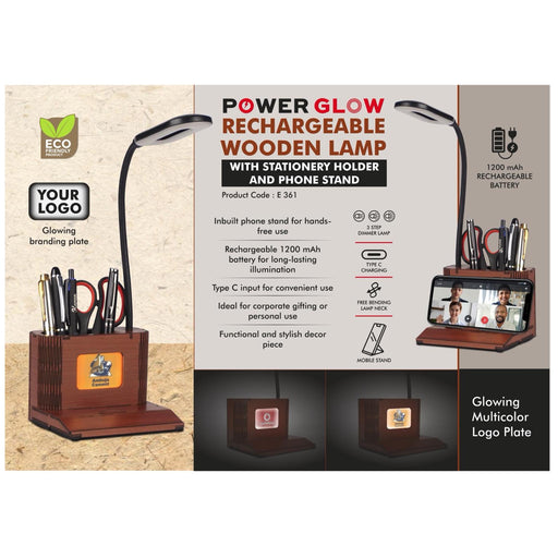 PowerGlow Wooden 3 step Dimmer Lamp With Glowing Multicolor Logo plate & Phone stand | Rechargeable 1200 mAh battery | Type C input | Branding MOQ 200 pc - E 361